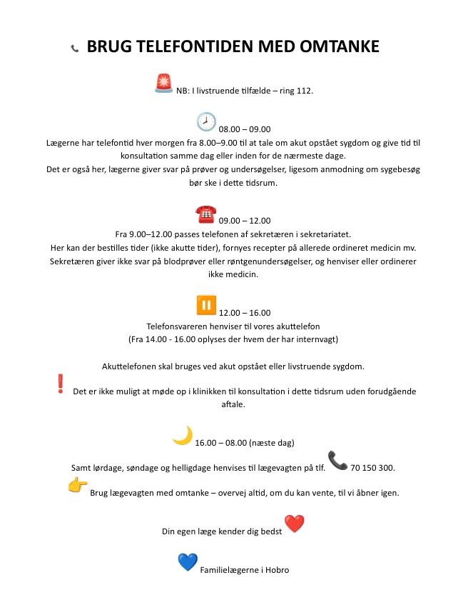 (ønskes senere tider, skal dette ske efter aftale med egen læge i deres telefontid)